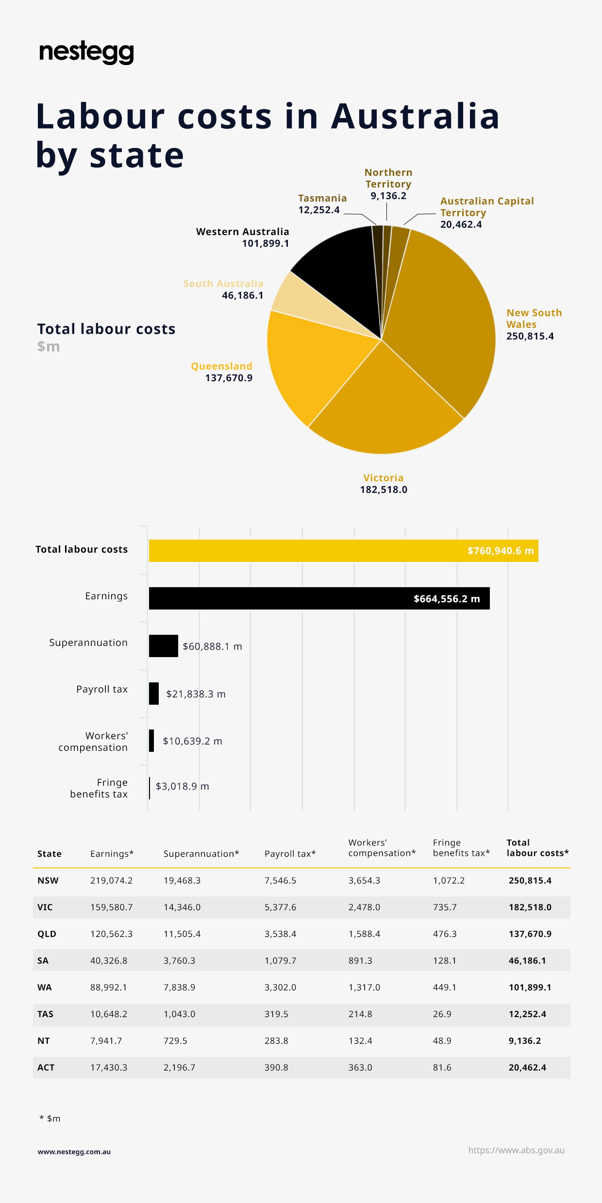 Victoria’s labour cost ranked second at $182.5 billion – with $159.6 billion accounting for its employee earnings and $14.34 billion for superannuation.