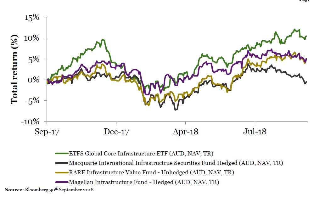 There is common belief that infrastructure is best invested in via active managers. Many believe that infrastructure requires a fund manager to explore every dam and toll road personally to ascertain whether it is suitable for investment, but the performance of some index tracking funds would suggest this is simply not the case. This is illustrated when we compare CORE to Macquarie, Magellan and RARE’s fund returns over the last year, with CORE’s simple low volatility, unhedged strategy winning out over this period.